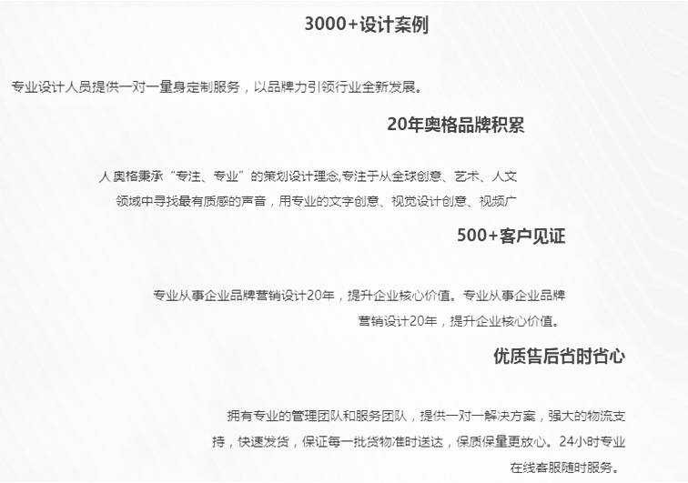 2000年至今,奥格专注于为企业提供品牌基础系统创建、品牌包装更新升级、品牌视觉传达系统等多项设计服务,奥格已经发展成品牌设计与管理公司,是中国创意设计的实践者。多年来,奥格以国际化的设计观和实务运作享誉业界,屡次获得客户的肯定与好评。我们汇集了众多才华横溢的设计精英,使奥格兼具严谨的分析能力和创造力,为企业提供多领域的创意设计服务。我们的成功来源于客户的成功,设计需要一个理解、尊重、宽松和充满激情的环境,只有亲密的合作伙伴关系才能如此。奥格将矢志不渝,秉承专业致上的理念,帮助客户洞悉市场先机,发展品牌资产,成就他创造价值。 |